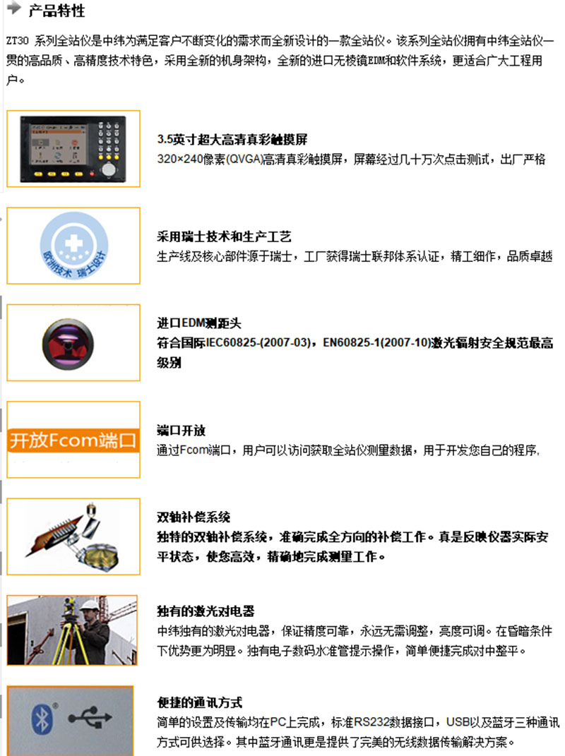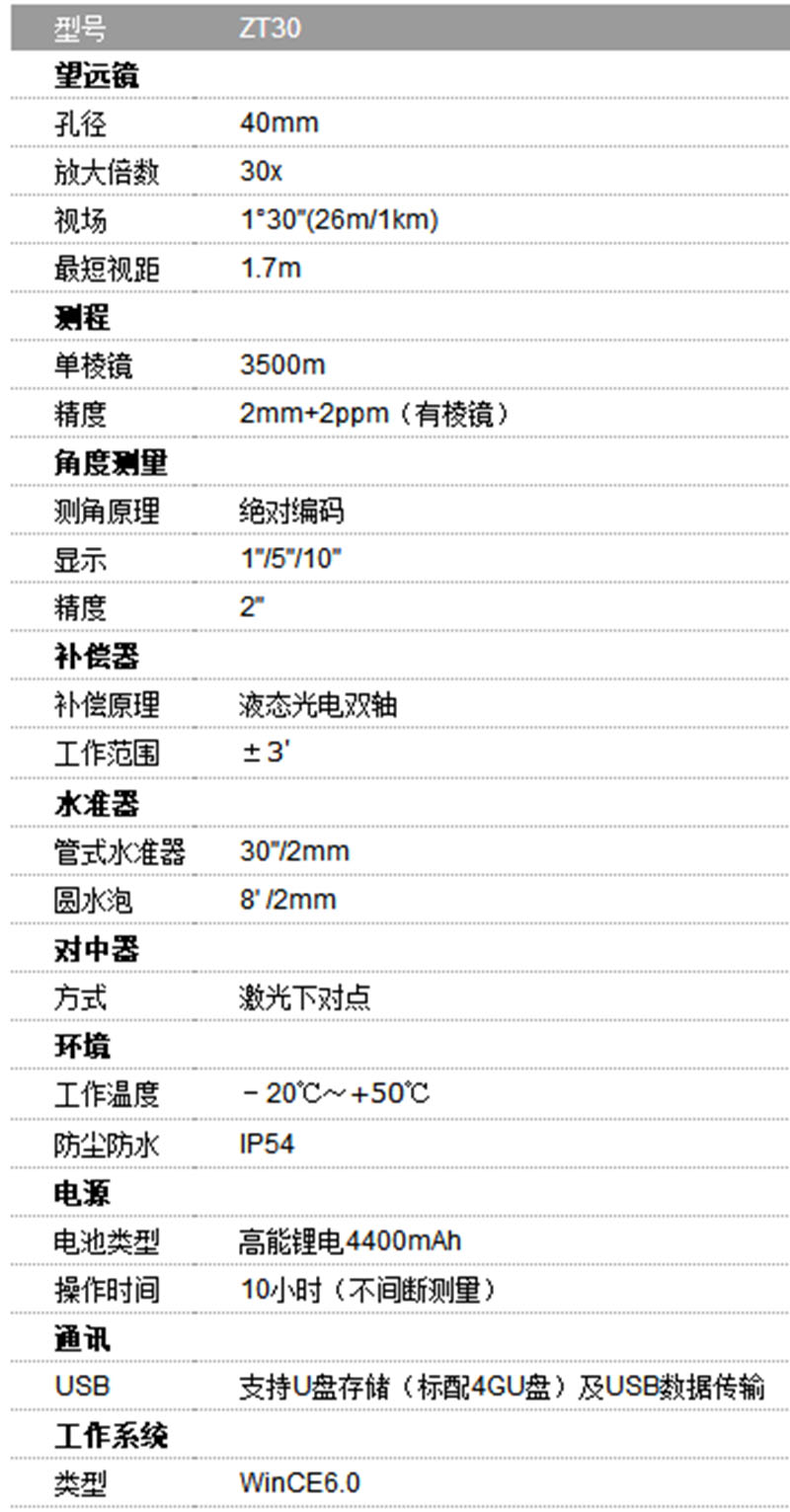 ZT30系列全站仪是中纬为满足客户不断变化的需求而全新设计的一款全站仪。该系列全站仪拥有中纬全站仪一贯的高品质、高精度技术特色,采用全新的机身架构,全新的进口无棱镜EDM和软件系统,更适合广大工程用户。
