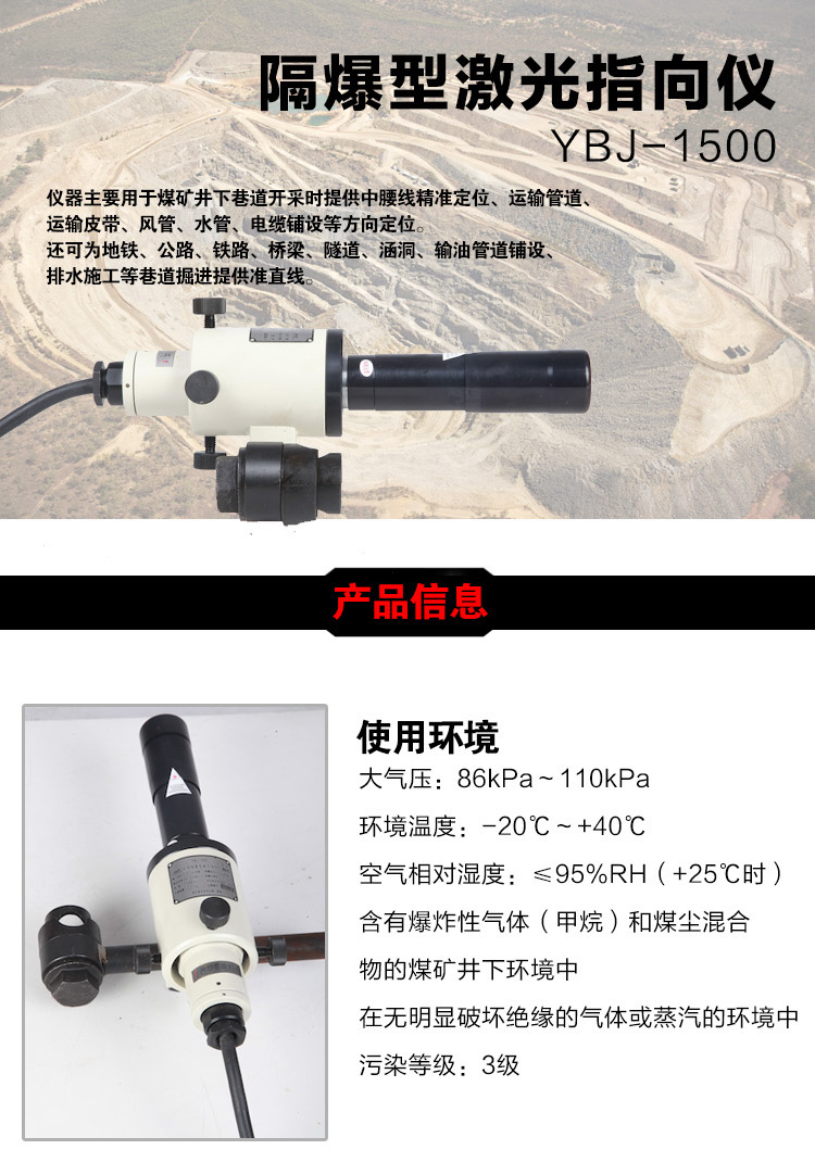 YBJ矿用隔爆型激光指向仪是集电子、光学、精密机械等技术为一体的仪器。具有外形美观、体积小、重量轻、防爆等特点。仪器安装采用固定式,通过悬挂组可快速固定在锚杆上。仪器可在360°范围任意粗调,微调准确;调节方便,制动可靠。产品采用自主研发的光学系统,可采用红、绿两种光源,光斑大小、射程满足矿下施工需求。仪器采用交直流转换电源模块,,交流宽电压AC80V~AC245V供电,具有保护功能。